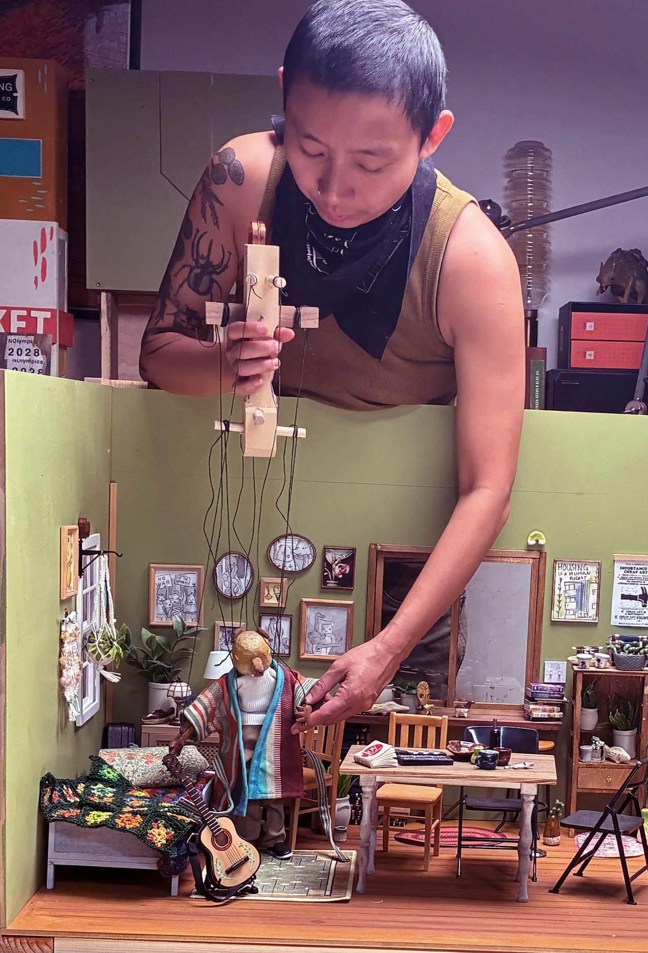 Shing and the Old Jones puppet and apartment set on a test shoot day.